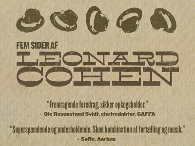 Allerede Cohen-fan? Eller helt ny? Vær med, når Mikkel Elbech fortæller om den canadiske sanger og poet. I stedet for at prøve at fortælle om hele Leonard Cohens liv og virke, dykker Elbech ned i fem sider af den mangefacetterede kunstner. Fem sider, der kommer til udtryk i både hans digtning, sangskrivning og hans optrædener: Poeten, romantikeren, profeten, munken på bjerget og den verdensturnerende entertainer.40 DKKBiblioteket Skælskør