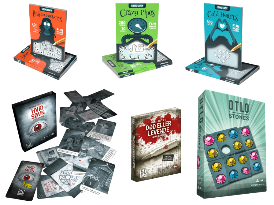 Jeppe Norsker er spildesigneren bag de populære nordic noir-inspirerede gådespil 50 Clues og en række andre grublespil. Du finder hans salgsstand i stueetagen, Stenstuegade 14. Her kan du også teste hans nyeste WIPs (works in progress) og så kan du prøve disse spil: