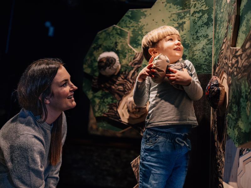 Når du går på opdagelse i udstillingen kan du bl.a. omdanne en digital græsplæne til en blomstereng, fange og se nærmere på forskellige dyr i vandhullet og gå på opdagelse i nattemørket gennem en sansevæg. Eller fordybe jer i en af de fire fortællinger, der knytter sig til områderne – eller resten af bibliotekets samling, der har fokus på bøger om natur, dyr i naturen, bæredygtighed osv.